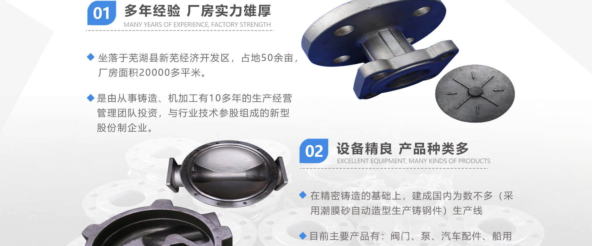 安徽偉工機(jī)械科技有限公司,坐落于安徽蕪湖新蕪經(jīng)濟(jì)開發(fā)區(qū),是一家専業(yè)從事鑄造產(chǎn)品設(shè)計、研發(fā)、生產(chǎn)、銷售于一體的企業(yè),公司為客戶的產(chǎn)品提供多樣的技術(shù)支持與設(shè)計,公司主要鑄造技術(shù)有潮模砂鑄造、硅溶膠精鑄工藝。主要產(chǎn)品有:不銹鋼閥門配件、泵閥配件、汽車配件、工業(yè)管道配件、工程機(jī)械配件、汽車配件等。材質(zhì)為:低合金鋼、304、316、316L、鉻鉬鋼、哈氏合金、碳鋼、雙相鋼等。公司已先后通過ISO9001和TS16949等多種體系審核,以完備的管理手段和齊全的檢測設(shè)備滿足客戶需求,進(jìn)的設(shè)備,専業(yè)的技術(shù),嚴(yán)謹(jǐn)?shù)墓芾?,穩(wěn)定的質(zhì)量。服務(wù)客戶,鑄造未來,偉工誠摯的歡迎新老客戶共同商洽合作